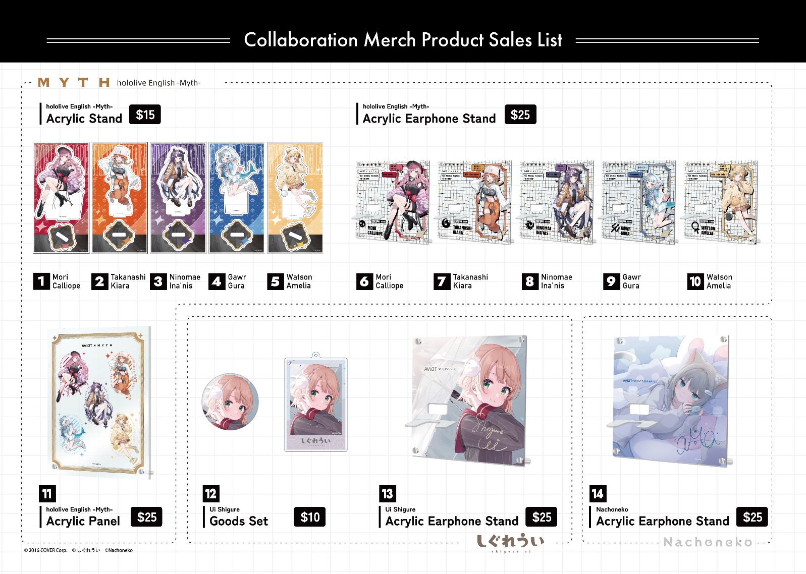 AVIOT will be offering a limited quantity of Vtuber collaboration merchandise for sale, marking the earliest release in the North America region. You’ll be able to purchase collaboration items featuring members of Hololive English -Myth-, Shigure Ui, and Nachoneko. The available items are pictured below: